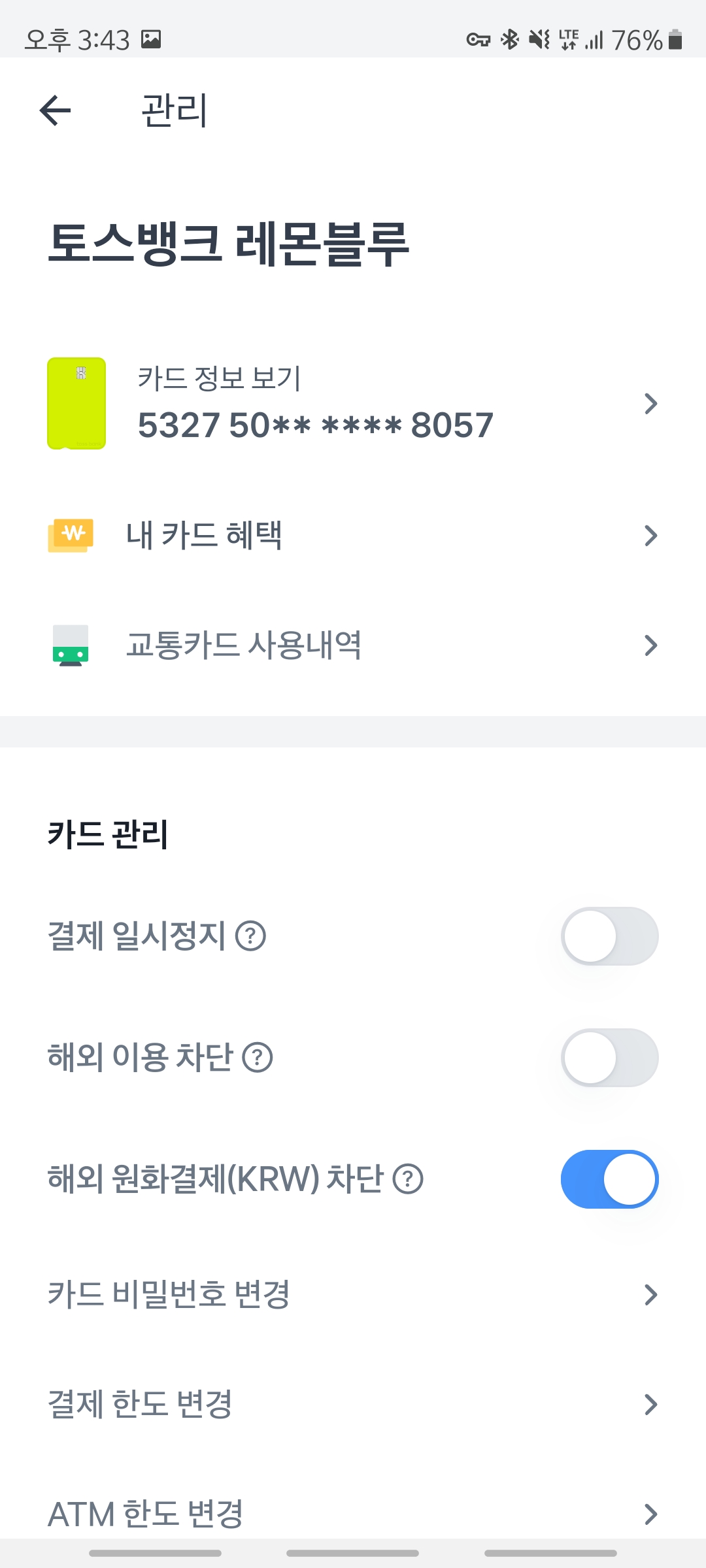 급하게 카드의 관리페이지에 들어갈 떄 필요한 기능들은 모두 한곳에 모여있고 설정하는 것은 식은 죽 먹기와 같았다.